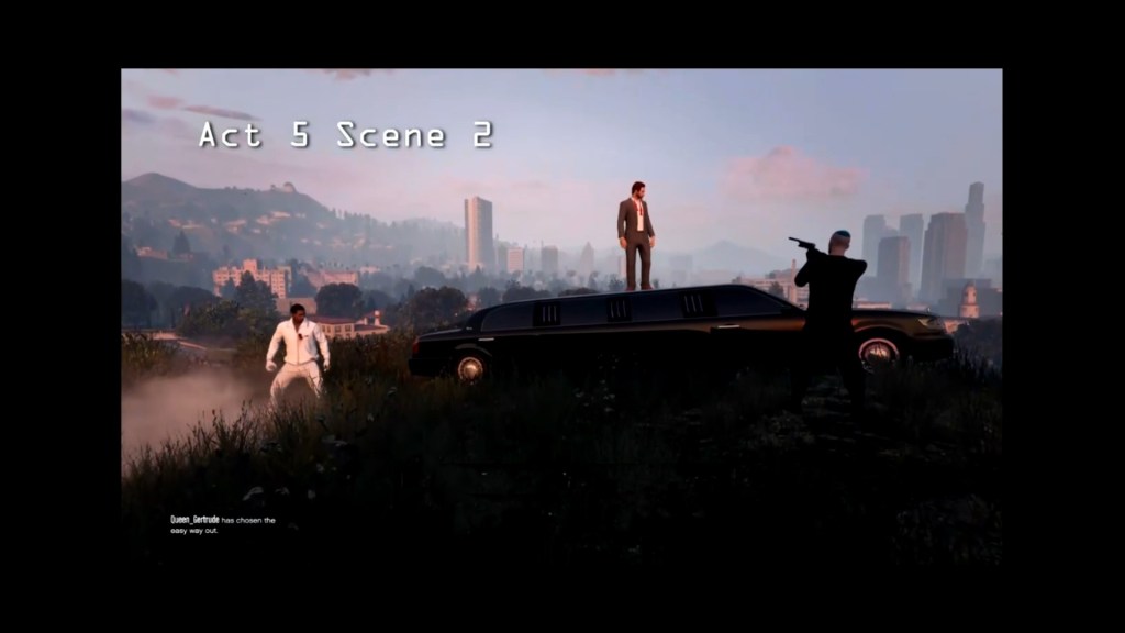 A genuinely postmodern cinematic artefact, produced thanks to the logic of the Leistungsgesellschaft observed by Byung-Chul Han in his The Burnout Society. Its chaotic digital/virtual thread manages to entertain in a mind-blowing way through its hybrid formal structure, fusing (a) reality shows with (b) gamer culture, and both with the harshness of (c) Shakespearean theatre, which, in itself, implied a meta-reality at the time (for example, the events of Hamlet take place in the Middle Ages, but in his mind, the setting was Kronborg Castle in Helsingør in the splendour of the 16th century). After all, this brilliant filmic mixture had to come from actors because they are used to changing masks (Greek prosopon and Latin persona, meaning ‘personality’); is it a coincidence, then, that Mark doubts whether he has a real job when he stages a virtual Hamlet because of the pandemic? ‘Dipo has a real job,’ he laments in the scene at the Los Santos subway station, which is not real but alludes to the original Los Angeles, CA. The actor, in a semi-documentary style, experiences the pressure to “do something productive” even in his leisure time, typical of the logic of the neoliberal Leistungsgesellschaft.