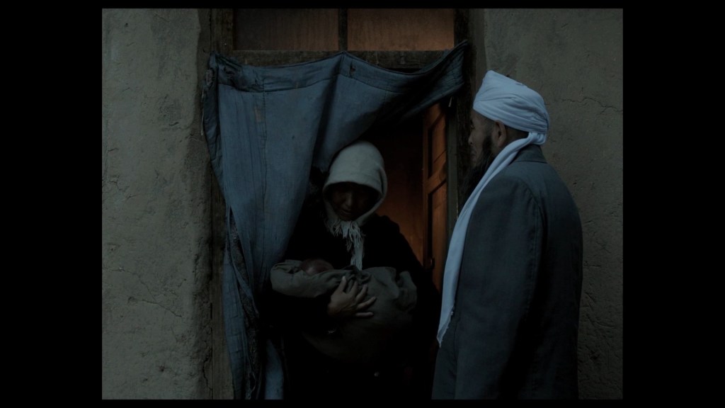 (b) It would be easy to say that one is not willing to invest time in films like this, whose lighting, photography and simple details (as is evident) required time. Let’s go to minute 26 of the film. Zishan has just taken a shower with a clay or terracotta jug – I don’t know – and when the scene cuts, we see him in a wide shot, crouching pensively, almost at dusk, in a static shot and focal length; seconds pass without any camera movement, the rain falls, we see how it soaks Zishan, seconds pass and the downpour intensifies, but the old man does not flinch. Seconds pass and with his left hand he picks up what appears to be a tiny stone, which he manipulates with the fingers of his left hand as if it were a rosary, his gaze still fixed on infinity, and he continues to crouch. There is a change of shot but in the same place. What is the focus? Zishan looks to his right and in the distance his bull is grazing.