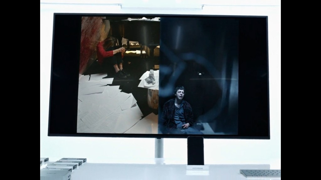 The meta-referentiality of the story proudly highlights its unhealthy ambiguity, as the viewer is unsure whose point of view they are observing. Simultaneously, the viewer observes three women in white in a kind of minimalist office, who are watching through cameras the same thing that Any is watching through her mobile phone camera, which is what her invention records (observes) in the home and whose recording can be turned off when Tom closes his eyes. More complexity is added to the equation when Tom, who is a writer, tells his wife that he will add ancient Greek choruses to the play he is writing, so there was – speaking for myself – the possibility that the three unknown women were a type of chorus that in classical Greece sometimes functioned with lyrical comments on the tragedy and interacted as in Aeschylus, and others as in The Suppliants, contextualising the plot.