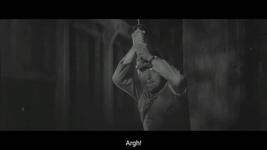 This is how the fire or loss of weapons and ammunition occurs in a bombing raid, and Aroun is punished along with Suzuki for being the ones who guarded the Emperor’s arsenal. When a couple of American soldiers are taken prisoner and locked up in the barracks, Mori discovers that Aroun speaks a little English, as the American asks for food. Mori, full of resentment, immediately tries to make Aroun look like a threat because, by speaking English, he could give information that could be considered espionage. He even sets a trap with a foreigner who asks him in English to pass him the keys to get out. Fortunately, Suzuki finds out about the plan and creates a false violent incident to get himself arrested and inform his friend Aroun as soon as he is taken to the dungeons under his custody. He does not take the bait and the foreigners are shot, although later, in a brawl in the dining room, Suzuki loses his temper in the face of a new insult from Sergeant Mori and cannot help but kill him. The fight scenes deserve special mention, as they were filmed on a low budget, which highlights the creativity of the models and other elements, as well as the enormous liveliness and unparalleled technical execution, especially in terms of photography.