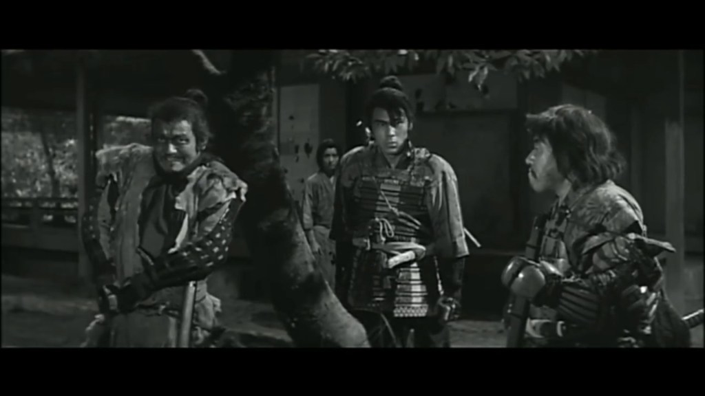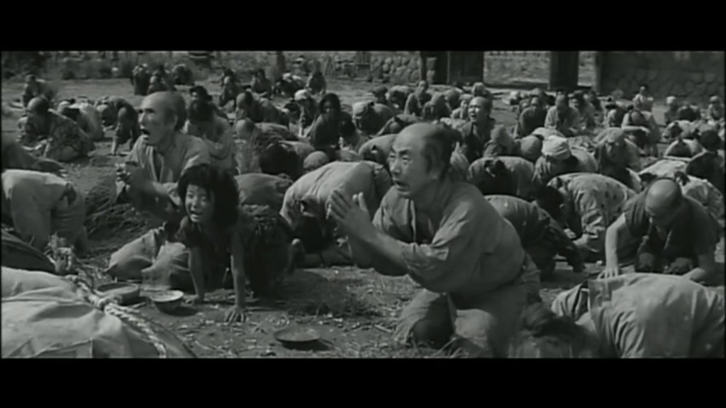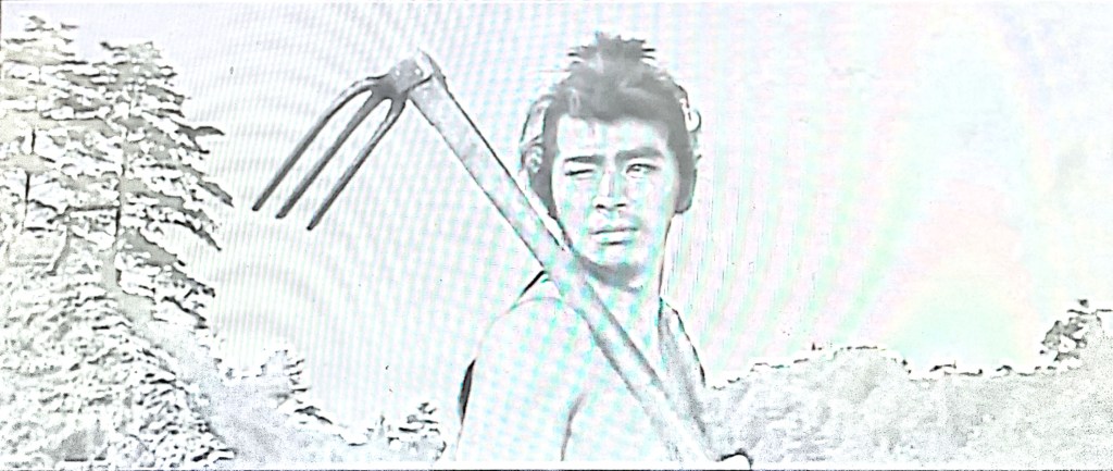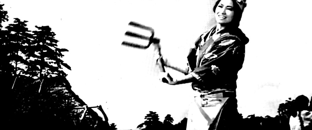 While they do so, one of the four or five scenes with choral songs in the entire film takes place, the next one at 00:53:00 and the following minutes until 01:01:00, with everyone working the land and ploughing in a bucolic and touching musical sequence. They all had a dream: Gen, after tearing up the flag because of Hayato’s taunts, carries the flag wrapped around his stomach; Seisuke does not forget his days as a farmer ploughing the land; and the leader Kashira imagines himself building a castle where he gives the orders. The local villagers mistake Gen for a prince of the Amagasaki family, and the bandits take advantage of the confusion to settle in the village without being pursued as thieves. From then on, Gen impersonates a certain Kazuko-sama, and meanwhile, the girls develop feelings for the bandit leader, Hayato, and Gen. Impersonating Kazuko, they agree to save the 28 farmers of the village who were enslaved day and night and who were already known to be killed once the wall was finished.