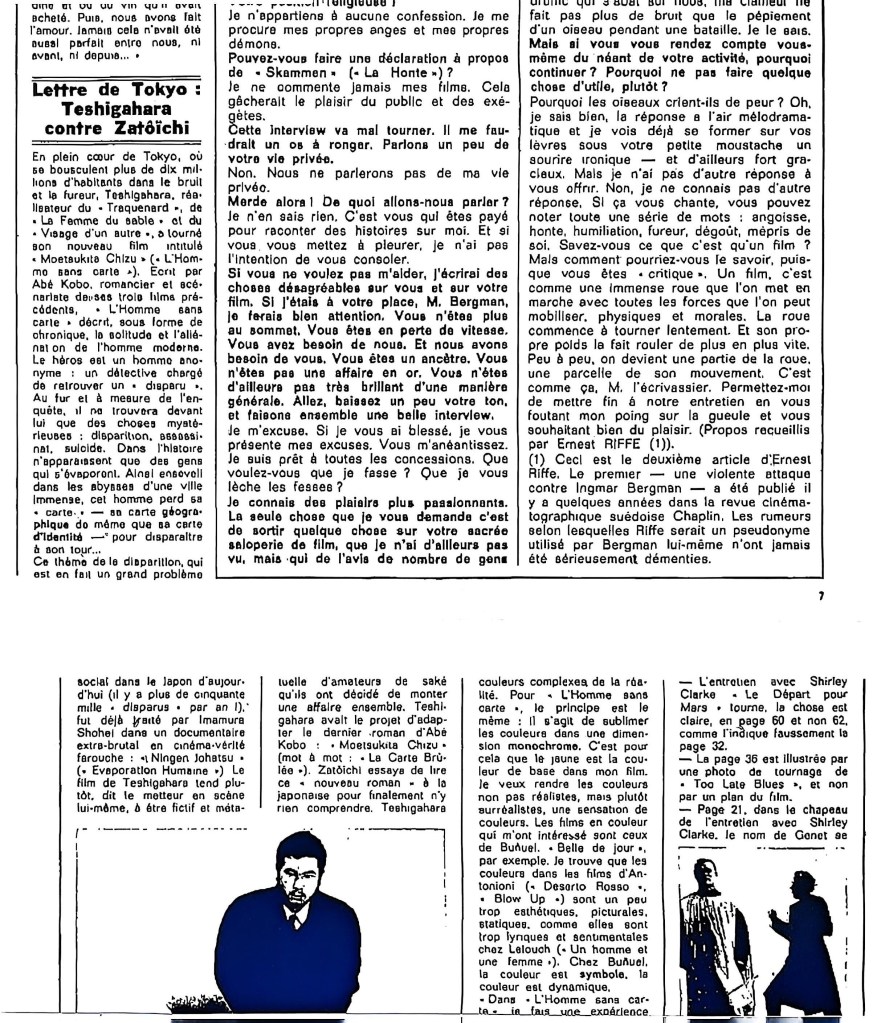 Moetsukita chizu rightly deserved an article in Cahiers du Cinéma (No. 206). Typical of Kobe Abe, through the dialogue and the indolence of the characters, the depersonalisation of post-war Japan is progressively amplified, to such an extent that it transcends the fictional context of the plot, almost to the point of cinema verité.Yoda Yoshikata, the writer behind Mizoguchi’s most important works, explains that Shintaro Katsu, who plays the detective in this film, was already the famous hero of the Zatôichi series when he met Teshigahara in a bar. Neither the director had ever seen an episode of Zatôichi, nor had the blind samurai seen any of Teshigahara’s films.