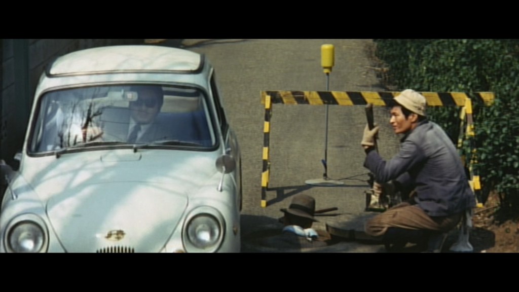 In any case, we must begin by acknowledging that the detective’s investigation was doomed from the start. It cannot yield results or solve the mystery of Nemura’s disappearance, simply because, through the process of his inquiries, the perplexed anti-hero deconstructs what could be called ‘mystery’ in the face of an urban topography of diaphanous chaos but inherent in an undeniable collective nihilism. It could not be otherwise; if a country, after losing a war, privileges material and economic reparation, how could the values that are seen here as non-essential have a voice and a vote, or be given special consideration? Nemuro Hiroshi’s wife hires the detective, but who will provide the investigator with more support or information, even if unintentionally? The wife’s brother, a well-dressed histrionic man with high purchasing power thanks to his involvement in the illegal world of blackmail and business with women and others. Let’s put aside, which is not a minor issue, the generalised indolence everywhere – not to mention the indifferent behaviour of people in their daily lives – in the city where a cyclist crosses the road while driving, without caring if the detective runs him over, or a public works worker almost in the middle of the street works on a sluice or street tunnel without protection or warning a few centimetres from passing cars (00:57:13), and when he sees the detective in his car looking scared or annoyed, the worker even replies, ‘I don’t care if I die’. This is the moment when any viewer, not just the detective, would be justified in saying that they are confused.