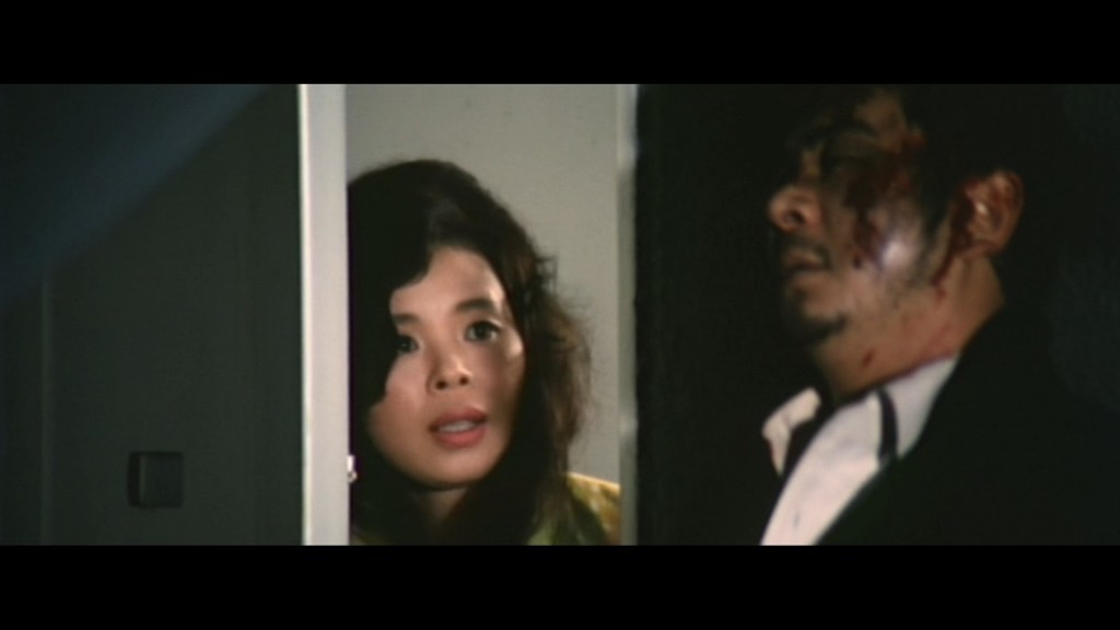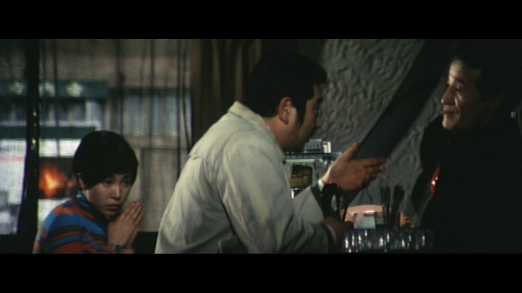 The detective is fired over the phone in the same Tsubaki café bar and clearly confesses to his wife in a later scene that no one seems to cooperate and everyone wants to know why he ran away or disappeared, but no one is interested in where he is at the moment. Y.K. is right, as Yoshikata wrote in Cahiers du Cinéma (isn’t it ironic or a luxury that Cahiers, in the midst of structural change, with a more political bent from around 1966 onwards, devoted space to Mizoguchi and now to Teshigahara?). Y.K. is right, I mean, when he observes that the least metaphysical of the heroes, Zaitochi, goes through a plot of profound alienation and social depersonalisation that merits an extra dose of existential metaphysics. The contradictions do not cease. The woman confesses that her husband earned 60,000 yen a month, but isn’t the detective paid 30,000 a week? Before dying in circumstances that are not revealed but would not have been surprising given his usual environment, the brother had expressed his desire to pay the detective the entire month’s fee to find his brother-in-law: 120,000 yen. In any case, the detective persists even though the agency he works for has fired him. When he returns to the Tsubaki café bar and asks a couple of the regulars there about the owner, who had already shown him hostility on previous visits, he is surrounded by another group of diners who beat up the former detective, forcing him to go to his wife for help, covered in blood. After he recovers, the desire returns, and the film’s climax could not be crowned with less irony than the wife, who could not show less concern for Nemura, becoming sexually involved with her former investigator.