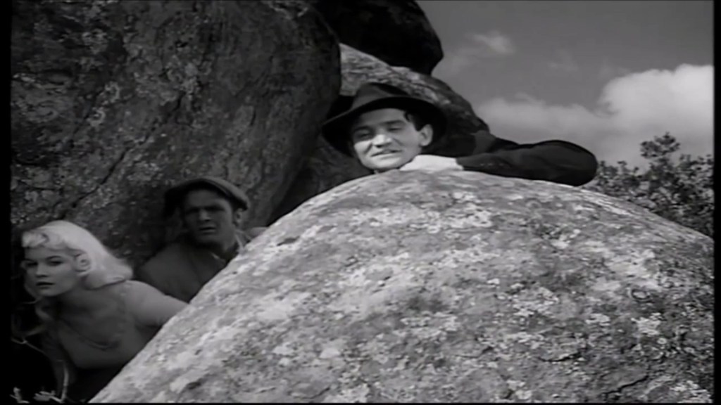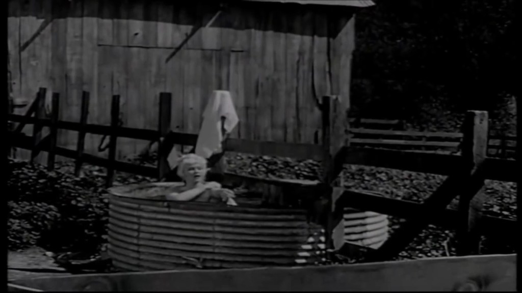 This is another low-budget B-movie that was destined to be released as a double feature with Bronson’s Machine-Gun Kelly. There with Kelly, Gerald Fried’s jazz in the background; here with Bonnie and her cigar, rockabilly in vogue since Elvis’s ‘Big Bang’. Someone wanted guaranteed fun to the sound of banjo-style guitar and said, why not a blonde? Why not a married blonde? That someone was the rogue Guy, who didn’t care that Bonnie was waiting for her criminal husband. Waiting is a euphemism; she was brooding over her anger at her misery, and the appearance of the pipsqueak was just what she needed. She almost emptied the hot oil on Guy for flirting with her shamelessly, and she was fired, only to receive a visit hours later from the insistent man with the machine gun.