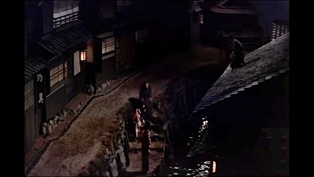 This is the tragic ending befitting all popular heroes who confront power: they either die betrayed or, like Benten, are cornered by the mistakes or crimes they committed in pursuit of their whirlwind of justice. On the ledge of the building, as the forces of ‘justice’ swarm around him to arrest or lynch him, Benten has time to slash the two thugs with his katana, and then he has just enough time to say goodbye to both women and Hamamatsuya before committing seppuku.