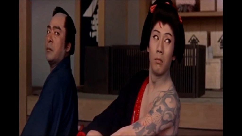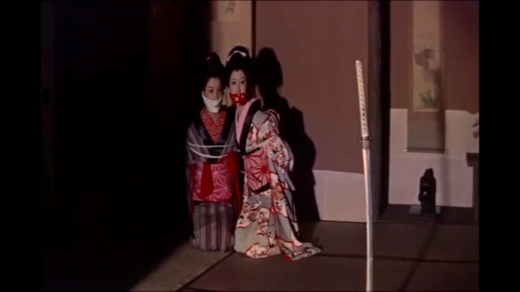 A thief who steals from a thief is forgiven for a hundred years, as the Latin saying goes. The disguise of the rogue Benten pays off because, like all antiheroes, at least at the beginning of his legend, he has emerged unscathed from the mansion of the retired nobleman worth 328,000 koku and has taken not only his gold but also his sex toy, Ohantan (Aoyama). He unmasked the other band of rogues that Nossuke had prepared as false priests, betrayed by their poorly fitting wigs. It was not out of kindness that Benten (Kikunosuke) freed the wealthy old man’s former maid. He took her away for his own personal enjoyment and had even grabbed her by the neck to rape her when Ohan cried out for her mother. The thief took pity on her, set her free and even threw her some gold, saying, ‘Give this to your father,’ referring to Ohan’s father’s long illness, which was why she had started working. This is an adaptation of the kabuki play ‘Shiranami Gonin Otoko,’ and its dramatic impact becomes clearer from minute 32 onwards, when Benten tries to leave Ohan behind, who could have been the victim of an assault, and she cries like a baby when she sees him leave.