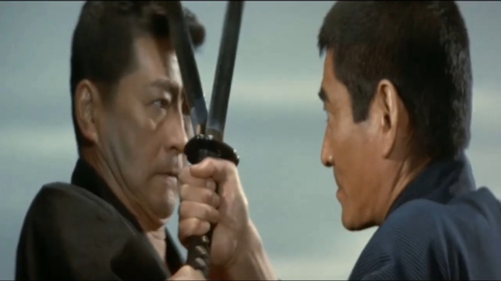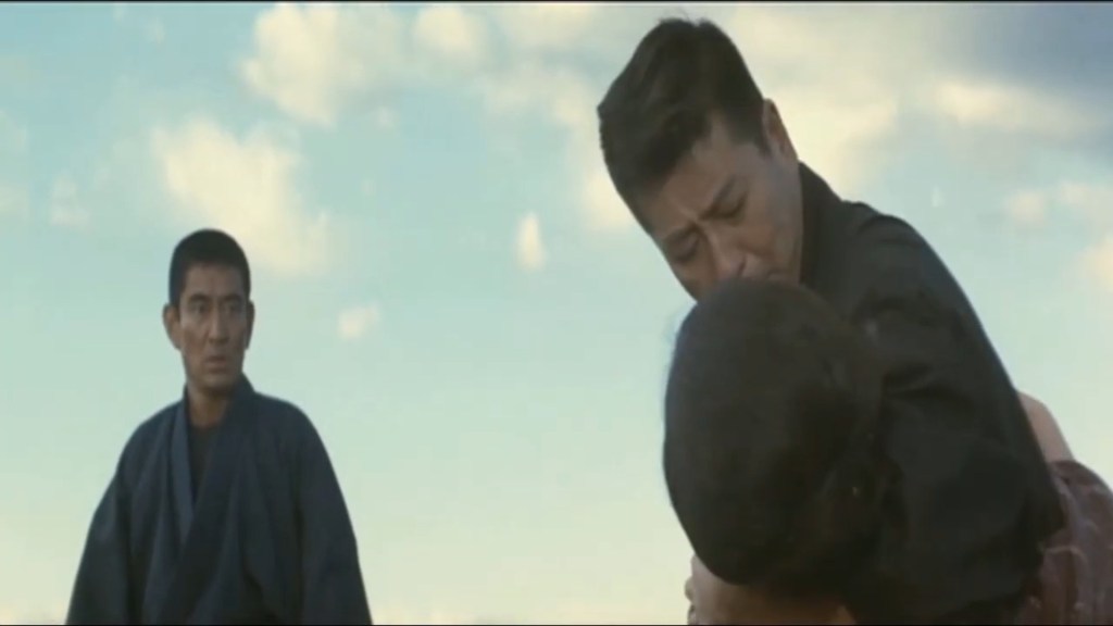 That is why the scene directed by Saeki, of the duel in front of the lake between Junichi (Ryo Ikebe) and Hidejiro (Takakura), although not loaded with sensationalism such as songs or melodrama in the musical score, as Masahiro Makino did, for example, who shot the sequence almost without repetition but with a series of very symbolic scenic embellishments. In any case, in this confrontation, which, as Hidejiro rightly said, ‘we hold no grudge’ despite the clash, the triumph of ninjō (人情) yakuza is evident, compassion before duty and loyalty, that is, giri 義理 to his brother Terada and, specifically, to his brother Terada’s brother-in-law, because when he was about to slash his opponent’s forehead, Junichi’s wife stepped in and died unjustly, he stopped instantly and forgot about the fight. But the brother-in-law’s disloyalty knows no bounds, and as Terada decided to cut off the fight against the opposing clan and forget the affront of four years ago, he even planned to participate in the Unuma Festival, but alas, his brother-in-law murders him and then, without loyalty but only cowardice, sends his henchmen to kill Shigure’s boss (Tsuruta). Seeing that they cannot overpower him with swords, he uses, as in other episodes of Chivalry, a gun, shooting him dead without dignity or loyalty to the rules. In fact, shortly before, he had used the desperate gambler Girenjiro to kill Shigure’s boss, despite what the latter had done to free his sister. We already know the carnage that awaits when Hidejiro and Junichi realise what has happened. A bloody and exciting ending for those of us who enjoy seeing justice prevail, even in the world of the yakuza and crime.