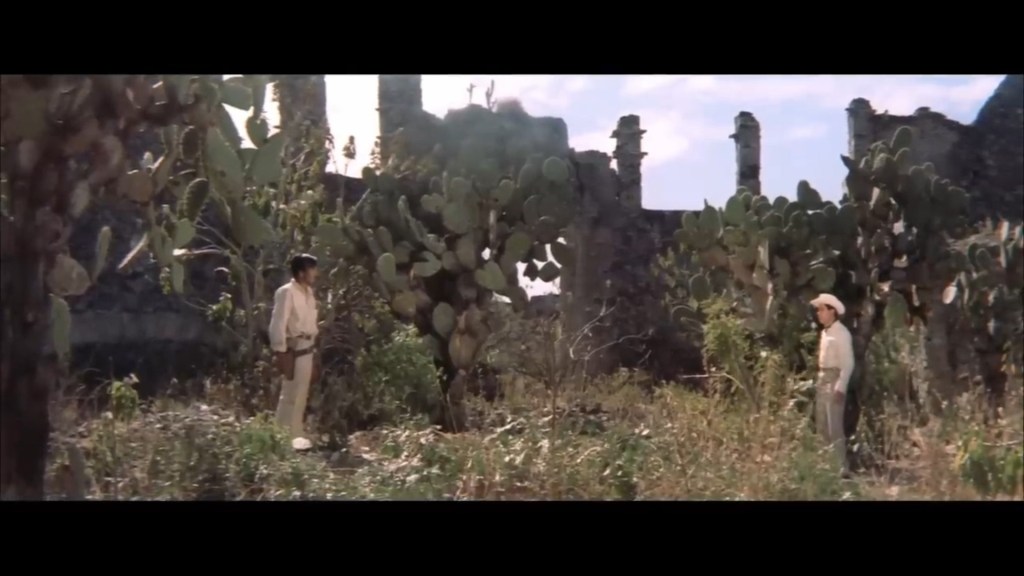 ¿No son Cj¿hile- chilaquiles? Pero en vez de pedir entomatadas hacen que la receta de los platillos mexicanos se modifique por su organismo de cristal en que el chile les cae mal. En fin. Cuando Joe intenta dar el dinero a María y la palabra del difunto Pedro “Pedro no es asesino” ella no lo cree. Pronto sabrá que el cacique del lugar engañó a todos para que el pueblo entero odiara a Padro por creer que sí, en efecto, fue el asesino del hermano de la mujer que amaba. Cuando comparan los colgantes que María le dio a Emilio, se dan cuenta que fue él, Emilio el asesino del hermano de María. Los paisajes son pintorescos y no os perdais el tiroreo del final, duelo en el Corral O.K de Cactus. Cuando ya habpia batido a Emilio, el muy sagaz y pillo le engaña y casi le dispara de no ser por Salvador, el alcohpolico en su etapa de redención. Le perdonamos los errores, por ejemplo que Pedro antes de morir haya dicho que María y su pueblo estaba en Guanajuato pero las locaciones sean en Guerrero (presumiblemente Taxco según mi última visita). En fin, entretiene.