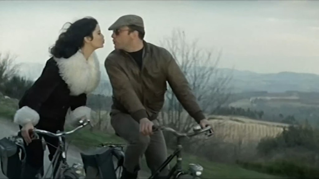 The sequences with Marie-José Nat and Trintignant in the countryside riding bicycles in a torrid (though fake, as we will see at the end) romance in which she, the femme fatale, repeats over and over again that he should use his share of the 800 million to go live in Ireland, where there is no extradition, are beautiful. They kissed, they loved each other, they fell out and then they enjoyed the fair and the merry-go-rounds and were chased by motorised police, and was it all a lie by the agent or informer Electra? Phew, I thought she would betray him, but as a villain for money and not as an agent of justice, which is what I call a very good performance of meta-falseness, that is, an actress portraying the falseness of an agent who represents or acts as a villain.