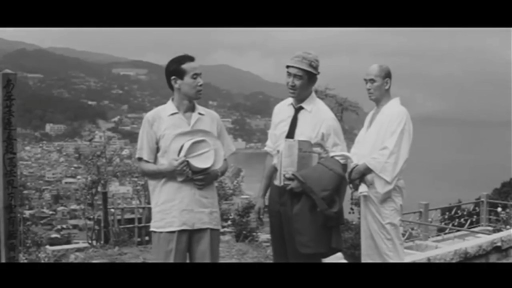 Ishii post-Shintoho bankruptcy. The train bound for Irimo Ito, filled with newlyweds on their honeymoon, promised journalist Shiro Wakamiya of Tohto Weekly a peaceful and, at most, fragrant workday thanks to the scent of Cattleya orchids from the moment he entered the carriages; couples snuggled up together, a lone lady reading philosophy, specifically Sartre’s ‘Existentialism is a Humanism.’ What could possibly go wrong with the visit to interview Professor Shimauchi about modern wives and the role of women at the Nishiyama Ryokan inn? This work is interesting as a mystery, but weak both as a noir due to the counterfeiting of dollars, and as a thriller or suspense story because there is never a sense of danger or ill will towards the journalist Wakamiya for bringing the whole scandal to light (with only 15 minutes to go), even though no viewer can deny that there will be at least five deaths from strange causes, starting with the fake suicide—from the cliff or into the sea—of Takeo Terada, who in reality was not newly married and did not commit suicide because his name was not Takeo, but rather he was an undercover police officer named Yasuo Iwabushi, who was investigating and monitoring —and blackmailed—the Military Research Institute headed by Colonel Shoichi Okuda as director, who also dies because he was trying to create his own network for counterfeiting Japanese banknotes with the fake interviewee Professor Shimauchi. But worst of all, although he apparently had ties to a printing press in the town of Manazuru, that place was burned down and in any case was too small to counterfeit all the fake money there because, as I said and you will know by the end, two crooks counterfeited money quite apart from the leader of the organisation to which they also belonged.
