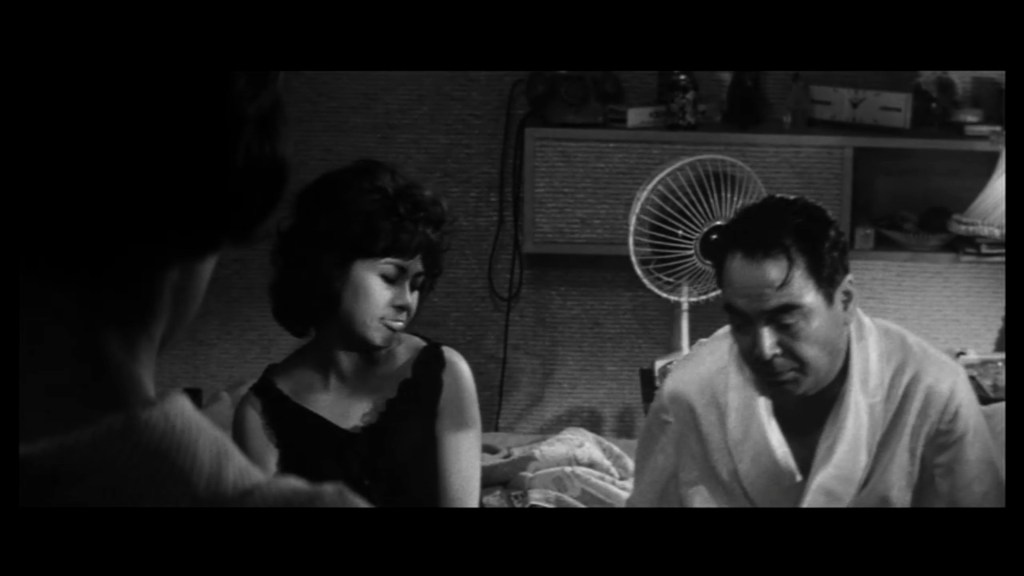 Pero no se asusta en absoluto” revela una doble necesidad compulsiva de primero de control emocional sobre otros, y luego invitar o destapar la imaginación mientras él, Ippei se acuesta con Mashika. Los comportamientos de Ippei sugieren características evidentes y consistentes de un trastorno narcisista de la personalidad con rasgos manipulativos significativos, pero repito que la genialidad de Mishima es ir develando cómo Yuko no es menos perversa, como se verá, ya que había asegurado que no iría jamás a ver al marido con la amante pero los gritos de reclamos chillones de Koji le cambian de parecer y es cuando ocurre la escena en el minuto 33 aproximadamente en que con la llave le rompe la cabeza a Ippei, en una escena primero vergonzosa, y después cuando Ippei abofeteaba a la guapa Wakao, logrando con facilidad hasta infantil la explosión (impusliva, reitero) de Koji. Yuko, después de purgar sus once meses de condena por el derrame o parálisis de Ippei, le confiesa en el poblado pesquero adonde ahora vivirán los 3, le confiesa digo, la angustia que sentía por no tener un crimen a su nombre como el que él, Koji cometió, y eso había crecido en ella con intensidad. Vaya, aquí ya estamos con un personaje de Cronenberg, uno de esos placeres oscuros que alimentan la mente con lo moralmente perturbador. Obvio que se refiere específicamente al crimen original con la llave inglesa que Koji cometió contra Ippei antes de ir a la cárcel, no al crimen final de la muerte de Ippei. El director Tomimoto no soslayó del original ni soqiera la escena malsana de la cascada, ya estando viviendo en el pblado de pescadores.
