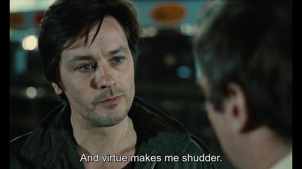 Cuando al final está frente a frente a Fondari quien casi hace que sus secuaces le inyecten y maten de no ser por el comisario Pernais, finalmente le revela el asesino y el final es una escena sólida. Fijaos en Delon Los psiquiatras del proceso dirán que…. ¿cuál proceso?” The shrinks at the trial… y lo interrumpe Morot “What trial?”le grita Morot. Fijaos en los ojos de Delon cuando lo jalonea el inspector, hay tristeza en sus ojos pero, por menos de medio segundo su semblante parece que deja escapar una sonrisa que no llega a ser sonrisa, quizá de que ej asesino de su amigo pagará,Adrien Morot pagará, frunce el ceño entonces y responde “el suyo”. Entonces termina la idea “Los psiquiatras del proceso dirán que es usted un fanático y un paranoico”. Morot intenta escapar al darse cuenta que está rodeado y muere de una bala de quien odia las armas pero la prefirió ahora antes de morir con el policía corrupto al que alude el título. Audiard es un genio con sus diálogos. Al final mirando la Eiffel Xav recuerda que pronto vendrán más políticos corruptos y encubrirán todo o distintos fraudes “The only ones who´ll suffer are the salmons”.