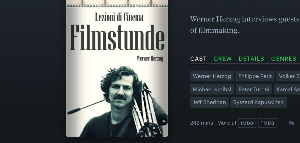 Punto débil: algo aburrido, no es cine, sino narrativa en forma de conferencia magistral sostenidas en la Vienna austrpiaca en 1991. Punto fuerte: oro molido en trucos y consejos prácticos para cineastas todo extraido de confidencias y anécdotas extremadamente íntimos del funambulista Phillip Petit, sus actos de magia con una moineda María Antonieta y el modo en que se preparó 6 años observando y midiendo las Torres Gemelas para lograr aquella hazaña por la que fue arrestado y luego exonerado con tal de hacer magia en el Central Park. Herzog subraya que si alguien desea filmar debe estar dispuesto a arrastrar un barco de 340 toneladas métricas gracias a lo cual pudo originarse Fitzcarraldo, además de mostrar la falsificación del documento en Sudamérica en que con el truco de un permiso se hixo la cabaña para establecerse mientras se rodaba el filme. Tal vez un buen pretexto para presentar a Phillip Petit y su hazaña en el Teatro Apollo pero recordar los 1350 Fts o sea más 400 mts en que se columpió en las Torres gemelas.