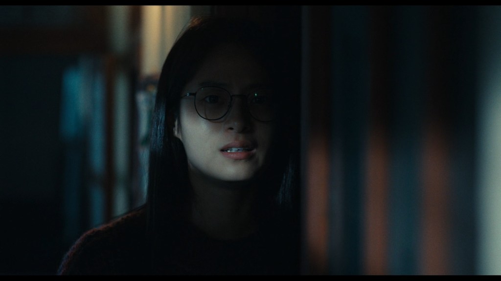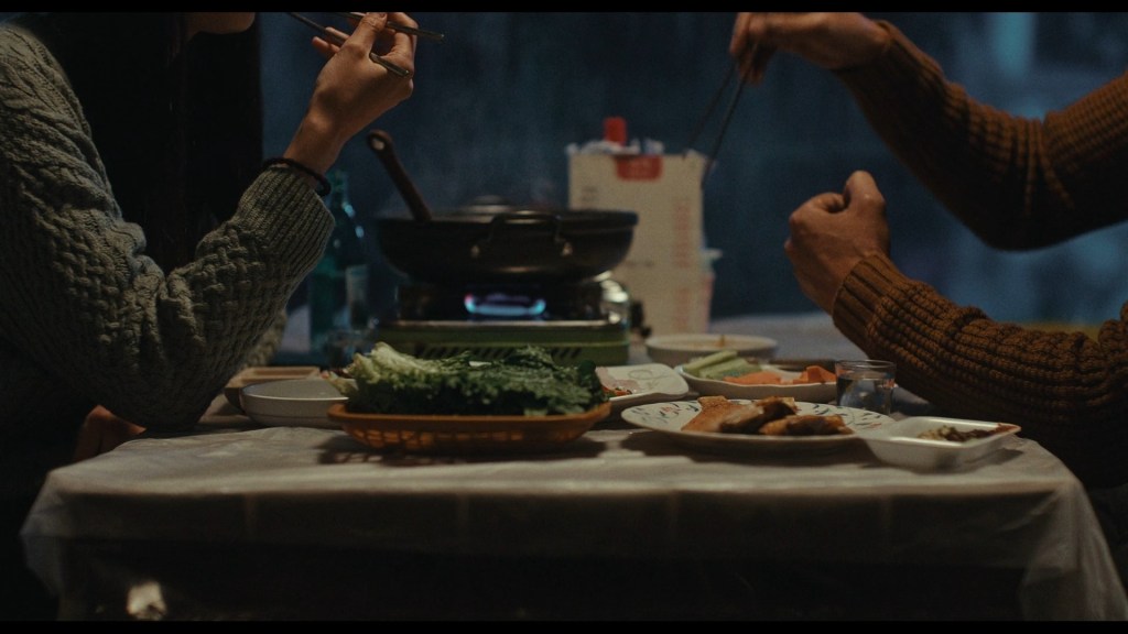 La historia tiene un ritmo acompasado, casi de contemplación que la vuelve irresistible para los que nos oponemos a las escenas comerciales de relumbrón. Me agrada la escena en que guiado por ella, ambos adivinan formas que se vislumbran en las montañas del Parque Nacional Seoraksan, una reserva de la biosfera de la UNESCO en Corea del Sur. Pero además, fijaos la cámara en los platillos rebanando literalmente las cabezas de ambos, foto que posa en la mesa y la cocina autóctona, la escena en que él le pidió salir a cenar pero los sitios a los que ella lo invita lucen poco fancies o sofisticados. También aprovecha a recordar a su hijo y ex mujer. Pero la escena de emociones mezcladas es la elección de su vestido hanbok para la celebración importante en Corea del Seollal. Cena que lamentablemente será amarga por descubrir que su padre las abandonó. Es poco usual, por no decir rarísimo que un cineasta contemporáneo tan joven como Koya Kamura sepa muy bien como rematar una historia, sin payasadas sin chantajes ad misericordiam ni efectismo lacrimógenos de Netflix y otros.