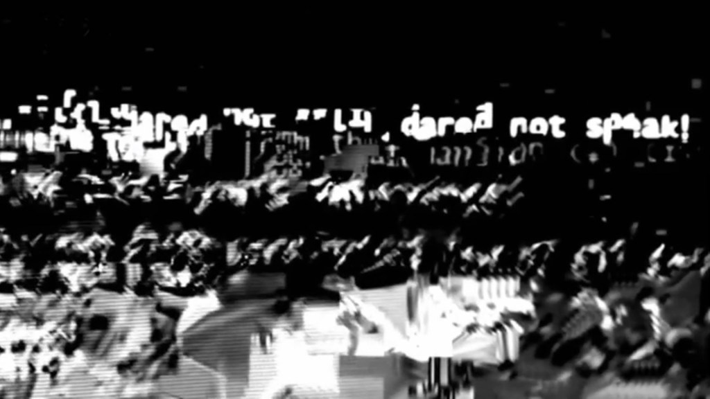 Pero el recorrido se vuelve sórdido cuando se emplea el glitch para borronear entre pedazos de o miembros como un rostro las frases Dare not to speak; en “La caída de la casa Usher” (The Fall of the House of Usher) Poe explora uno de sus temas recurrentes, el entierro prematuro de la hermana del protagonista, lady Madeline. El texto distorsionado adrede incluye frases clave como “dared not speak! we have put her living in the tomb” (¡No me atreví—no me atreví a hablar! ¡La hemos puesto viva en la tumba!), que es un diálogo directo de Roderick Usher al narrador, revelando el horror de haber sepultado a su hermana aún con vida. Las repeticiones de “A ghost” (un fantasma) refuerzan la atmósfera gótica y sobrenatural del relato, anhelando febril el regreso espectral de Madeline y el colapso mental de los personajes.