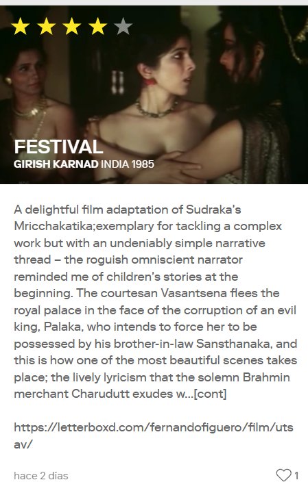 Deliciosa adaptación cinematográfica del Mricchakatika de Sudraka; ejemplar por abordar una obra compleja pero con una indiscutible sencillez del hilo narrativo -el pícaro presentador omnisciente me ha hecho recordar al inicio los cuentos para niños-. La cortesana Vasantsena huye del palacio real ante la corrupción de un mal rey, Palaka, pretende obligarla a ser poseída por su cuñado Sansthanaka y así es como tendrá lugar una de las escenas más lindas; el lirismo vivo que desborda el solemne comerciante brahamán Charudutt con su flauta y enseguida con su canto es hechizante no solo para el espectador sino para la propia ramera Vasantsena quien resulta anonadada al esuchar la entonación del brahamán en plena noche, en el templo a Cupido. La complejidad radica en entender que una meretriz en fuga, hija de una familia rica pertenecía a una clase importante como la de las cortesanas -no era una casta o clase deleznable ni mucho menos- se refugia con un mercader excesivamente pobre. Digno de delite es todo el tiempo del mundo que le dedica casi 1o minutos para la escena en que torpemente Charudutt ayuda a la cortesana a despojarse de esclavas y pulseras metálicas -aprovechando también que no se encontraba la guapa esposa Aditi- mientras los escarceos Vasantsana-Charudutt afloran hormonas en ambos a mil por hora sin que la tenue luz impida imaginar ni perderse detalles, es decir. al dente lumínico. Cuando días después la madre le reproche haber olvidado sus halajas allí con un pobretón eso molesta a Vasantsena.