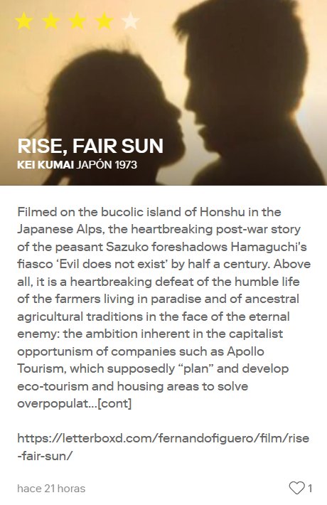 Filmada en la bucólica isla de Honshu en los Alpes japoneses, la desconsoladora historia de posguerra del campesino Sazuko presagia con medio siglo de anticipo el fiasco “Evil does not exist” de Hamaguchi. Ante todo una desconsoladora derrota de la humildad de vida de los campesinos in situ en pleno edén y de las tradiciones agrícolas ancestrales frente al enemigo de siempre, la ambición inherente al oportunismo capitalista de empresas como Apollo Tourism que supuestamente “planifican” y desarrollan espacios ecotusrísticos y de viviendas para solucionar la sobrepoblación ante el brutal crecimiento demográfico. De por sí Kumai no nos ahorrará previamente la ingratitud de Sazuko viviendo con una tenue pero visible renuencia a la generación de su hija Haruko, entre otras cosas por estar enamorada del joven cantero Asao con costumbres que nada tienen que ver con el campo.