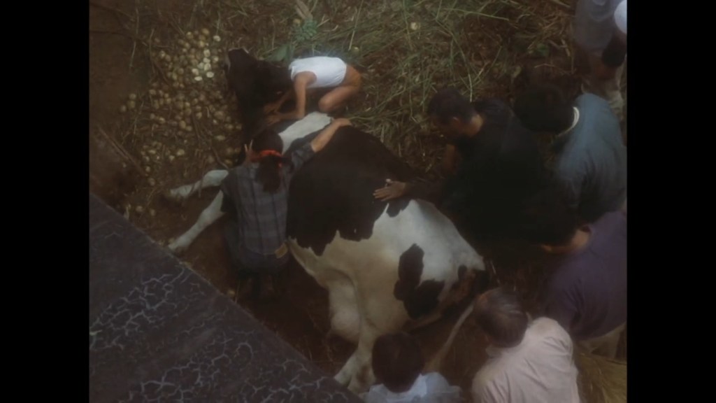 Pero a Kumai tampoco le faltarán las evocaciones hermosas del campo. Cuando se enferma la vaca Kure, el llanto de los niños y de los viejos por la vaca, por la cual se tuvo que ahorrar, y ahora en un vano intento por hacerla que se desinfle de su indigestión, fallece enfrente a la multitud de agricultores acongojados. Es cierto que hay un conflicto generacional entre el campesino terco y su hija, por estar enamorada de Asao, el cantero que al principio mira la vida igual que Haruko 春 hija de la primavera, pero muy pronto las cosas van a cambiar porque el propio granjero mientras araba el campo se encuentra una vasija del periodo Jómon, un periodo antiguo de hace 10,000 años según Sénsei Gomi, y eso cambia todo en Takimigaoka. En un santiamén ya había máquinas retroexcavadoras, paleontólogos y gente husmeando y pisoteando las tierras en las que esta plétora de gente humilde y trabajadora llevaban generaciones de cultivar con diferentes artes, que ya casi se extinguen. Sazuko de por sí terco es intolerante y se lía a los golpes y puñetazos a los trabajadores y más temprano que tarde Asao es convencido por el ambicioso Inagi para trabajar en Apollo Turism, la empresa que adquirió todos los terrenos del lugar y terminará despojando y arrojando fuera a todos, no sin antes la junta con mesa de negociación o anuncio (escena y motivo idéntico que fue plagiada por hamaguchi en “Evil Does Not Exist”) se presentan los forasteros, les platican el plan y nada les importa que arrasarán con el Bunabayashi o biosque de hayas que era terreno virgen literalmente. Es una obra que da tristea pero también rabia porque hoy medio siglo después en lugares como México siguen ocurriendo esos ecocidios y devastación natural como sucedió con el presidente corrupto Andrés Manuel López Obrador que dilapidó en 2023 y 2024 cenotes y miles de ceibas petandras el árbol sagrado de los mayas para construir un tren Maya inservible y costoso que hoy endeud´a un más al país. EN algún momento casi al final, Sakuzo será arrestado por ser culpado del incendio que se desatará en el sitio a pesar de que Asao se adjudicó la responsabilidad. Todo ocurrió después de que Apollo Tourism a través del nefando Inagi y sus esbirros saboteó los cerdos las vacas y en suma los animalitos de los granjeros para obligarlos a abandonar su tierra por las malas ya que de otro modo legal no lo consiguieron.Ellos mismos, los pobladores,se comenzaron a culpar del sabotaje y el colmo fue que la abuela Ohiteba se ahorcó. De verdad es casi imposible evitar lágrimas con las actuaciones, los rostros no solo de Nakadai, y en la escena en que están de pie frente a la máquina que desbarata de una vez la casucha donde vivían en la pobreza pero felices con su montaña y su pez, su vaca, su cielo y sus cultivos. Los seres humanos tenemos lo que merecemos cuando permitimos que ladrones como López Obrador en México y miles de consorcios y gobernantes destruyan la naturaleza que es de todos.