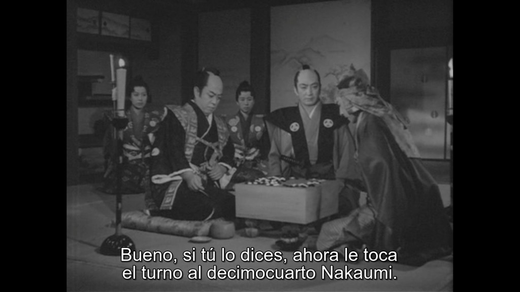 No tendremos que imaginarnos el disgusto del Señor Nabeshima Tango-no-kami, su rostro insípido mal escondió el enfado por ser rechazado por el invidente Ryuzoji y su familia. Imaginaos, unos vasallos que desprecian a su Señor feudal. Como dije, para aplacar el malestar, en mal momento se le ocurrió a Ryuzoji ir a los aposentos reales de Nabeshima y jugar una partida de go -囲碁, igo- el pasatiempo feudal de moda en Edo en aquellos momentos. ¿Pero existe mejor sistema con reglas que el juego, para enfrentar como iguales -siempre que se sigan las reglas- a los contrincantes, independientemente de ideología (como en el fútbol soccer entre soviéticos vs ingleses, o en un tablero o goban con piedras blancas y negras como fichas que se colocan estratégicamente? A medio juego, Mataichiro se excusa por un fuerte dolor de estómago y avisa que no tardará mientras ayudado por una sirvienta, acude al servicio de W.C pero mientras tanto, veremos cómo el consejero Toyohira sentado junto a Nabeshima descaradamente toma una de la fichas y la arroja fuera del tablero.