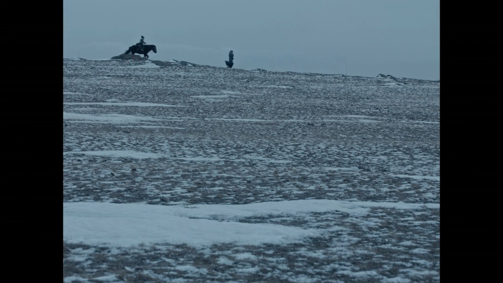 Las horas pasan, y los días y el temporal ocasiona una angustia insufrible y veremos asomarse o más bien mirar desde el interior a una madre sin quejas. En algún momento desaparece el rebaño que les sustenta, y temen hayan sido los lobos; la madre llama a la pequeña hija, “Angara, vámonos” cuando la niña montada se queda estupefacta por las cabras muertas, a media estepa, y las secuencias en la noche con la antorcha, Dios, qué trabajo tan sencillo y bien hecho. Sublime cuidado en la cinematografía.