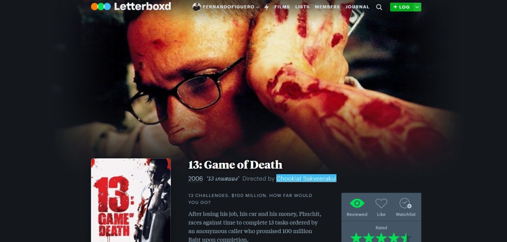 En el reto en que se le envia excremento y debe comerlo en el restaurant no solo está la humillación sino que la mujer y otros comensales permiten entender que su imagen propia se ha devaluado para él mismo -su compañera Tong inclusive lo sorprende en el lugar antes de vomitar- al grado de no importarle que le vea comer la deposiciones. EL reto por 800 mil BAHT de deshacerse de su teléfono móvil comenzará a arrinconar emocionalmente al chico, se entiende por ende la pelea en el transporte y caída, para después tener la obligación de ayudar a Chew, el abuelo de una familia que hace al menos 10 días está muerto y cuyo cadaver corrído, putrefacto, debe sacar del pozo, en la espalda en una operación denigrante y absolutamente infecta. La serie de retos o más bien atrocidades continuarán, son 13 y eso inckuye ingresar a un hospital siendo perseguido por las autoridades desde la mañana y secuestrando o extrayendo del nosocomio a una anciana casi en estado de demencial senil, confeccionar o atar una cinta a medio camino carretero con la que morirán degollados o exposición encefálica una decena de motociclistas y además, al darle alcance su compañera Tong, obligado a decidir entre asesinarla a ella o a su mascota pomerania ya sabemos lo que hará. COn el sable de samurai hace una carnicería de una vaca y más horrores hasya llegar al último reto de una persona sentada en una silla que se imagina es su padre, el cual en la infancia golpeaba a su mamá. Aquí se prueba la nobleza de Puchit quien, se rinde. Deja caer el cuchillo de matarife pero entonces sabremos que aquel de la silla de ruedas no es su papá, solo se lo imaginpo y además es otro jugador, John quien gana el reto de los 13 apuñalando a Puchit quien cae muerto ante las cámaras. Tong le grita asesino al niño y cabeza de toda la organización web, Mr.Kie. Y señala que escondiéndose en la máscara e hipocresía moral hay que ver todo lo que los humanos, sin embargo, son capaces de hacer por dinero. Es una historia triste, pero ¿todo lo que se acerca a la fidelidad de nuestros tiempos acaso no lo es?
