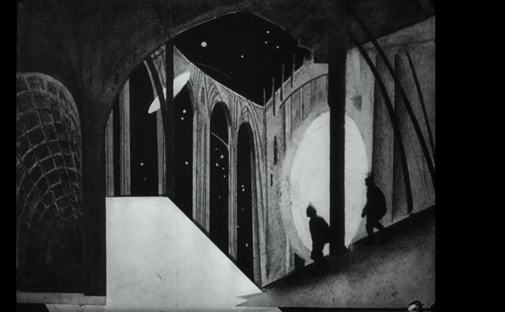 SOlo hay que aclarar que los nazis se valieron de banqueros alemanes y burgueses así que condenaron el capitalismo por raza, reformulando la noción de “capitalismo parasitario” y de este modo, poniendo imagen y cuerpo -el de los judíos- como el enemigo en su retórica política. El corto arenga a “ayudar a los prisioneros de capitalismo” EL acontecimiento que bien podría ocurrir 7 años después de la realización del corto, en 1929. Y de hecho veremos la nave espacial y los aeroplanos más bien submarinos o zepelines pero una imaagen curiosa son los 2 camaradas en esos pasillos cuya alucinante imagen recuerda la metafísica de De Chirico, fijaos en la teatralidad arquitectónica como en poenumbra, con luces oblicuas y un aire onírico y ominoso. Auanque se trate de un corto propagandístico, se trata de una obra ambiciosa y única.