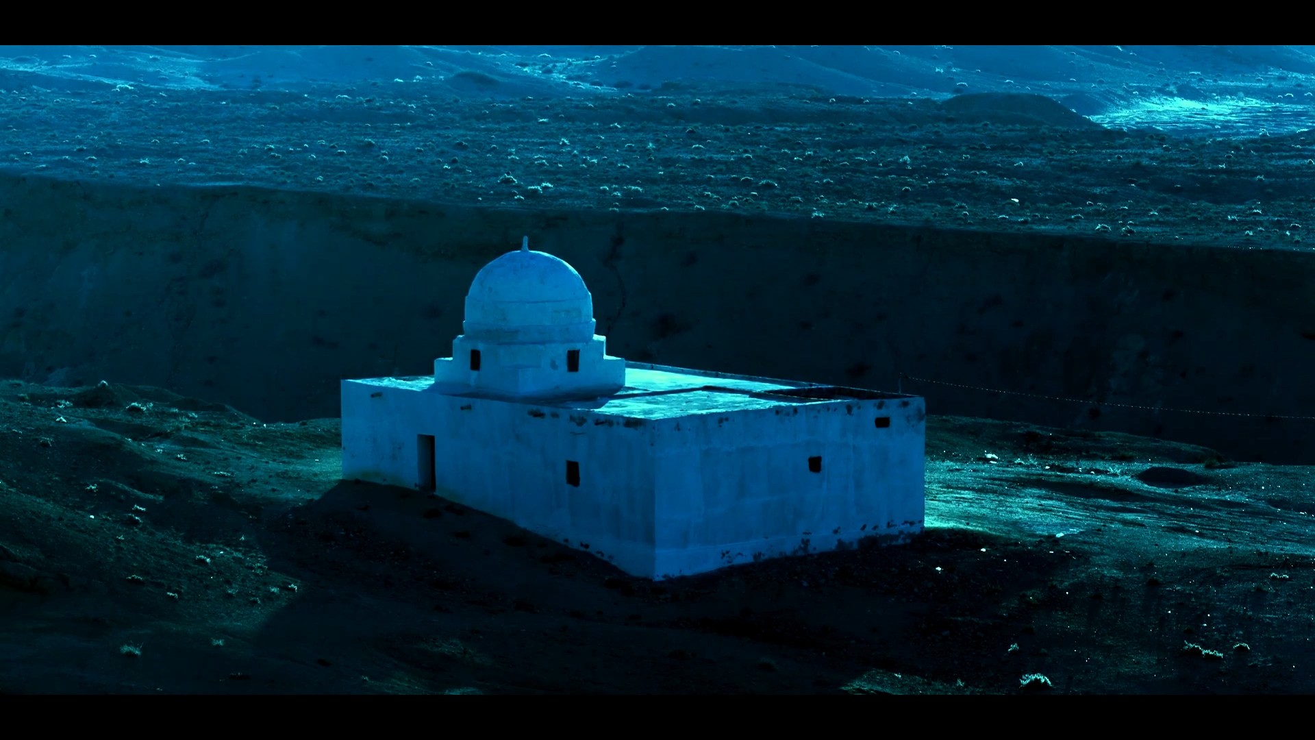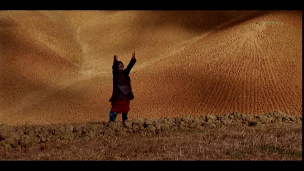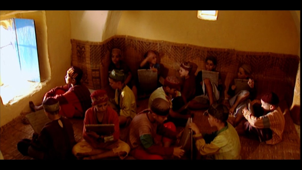 El colorido aquí lo llena un cinematografía reposada ¿cuantas horas o días -aun no creo fuese hecha al azar- para prodigarnos al hombre implorando a Dios por la lluvia, de pie en la hondonada mientras levanta los brazos en una toma amplia y soberbia mientras las sombras y la resolana se deslizan como nubes en la misma toma al instante? Reacia a divulgar sus motivospara hallar dicha fuente doble con una roca, el gupi tunecvino continúa el recirrido en la camioneta y el recorrido en su memoria repasando los cuentos, por ejemplo veamos a los niños abandonando la rústica aula y cantando “Dios todopoderoso, perdónanos, nuestros padres fueron injustos pero no nos castigueis por sus faltas y pecados.”