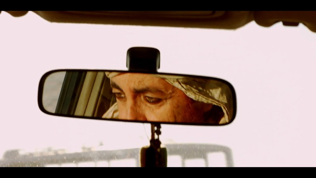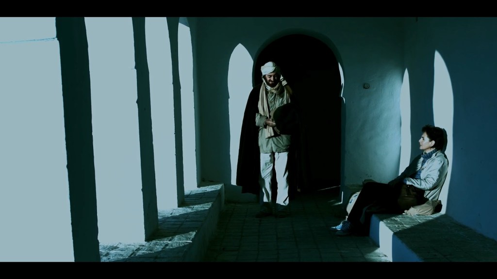 Otro relato significativo es aquel del Maestro y el niño discípulo que va a por el pan, y seguro de que su generoso maestro le daría una parte en agradecimiento, se come un fragmento desde antes de llegar y muestra la enseñanza del hambre a ambos. La clienta canadiense le pregunta si siempre habrá moraleja o mensaje y el guía responde que a veces solo hay que extraer por uno mismo la lección, como en el relato del viajero incansable que camina y camina y cansado se detuvo a la sombra de un árbol y se le antojó comer algo, de pronto apareció la sandía y viandas, se le antojó una alfombra para solaz recostarse con comodidad y apareció un tapete blando pero cuando se dispuso a dormir la siesta tuvo el repentino pensamiento opresivo de que podría ser blanco de serpientes venenosas, si se dormía, y justo eso estaba a punto de ocurrir pero el filme corta y la canadiense no pregunta y elguía no insiste y así se va construyendo, por decirlo de una manera, una especie de relativa complicidad de viaje. Interrumpido asiduamente por el teléfono, no sabe qué decir al familiar que le pide haga algo por sus dos pequeños con inquietudes para escapar al extranjero y entre tanto, el guía encuentra a la clienta canadiense después de que ella se ha perdido en el desierto. Sucedió que dormida en todo el paisaje arenoso, al despertar y escuchar un ave, la ha seguido, una especie de halcón o águila y llegando a una fuente, como la que buscaba, pone en entredicho realidad y ensoñación solo que no podía regresar a con el guía, por no recordar el camino de vuelta silbaba y silbaba y de este modo olvidó la lata de harina donde transportaba las cenizas de su madre para esparcirlas en dicha fuente que jamás volvió a ver. Me agrada la fábula del padre moribundo que pide a sus tres hijos que traigan lo más ligero que pudan comprar con una momenda antes de su muerte, Uno le lleva paja, otro unos sacos de plumas y el menor solo apagó las luces llevando a su padre una vela y entregando lo mpas liviano, un rayo de luz que suele llenar el universo. Al final, el propio guía deberá practicar lo que predica serenándose cuando recibe la llama de que sus gemelos hijos se han embarcado a un peligroso viaje como migrantes a Italia. Así concluye sin cerrarse, una tristísima noticia para el guía que le ruega no olvide la promesa de pagarle el doble por el tour,y un poco de resignación para la clienta que deberá aceptar que hizo lo que pudo por su madre emigrante hace mucho.