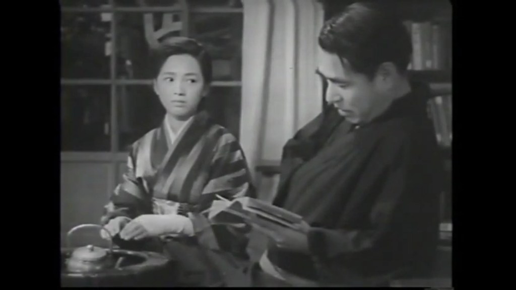 EL filme dedica una escena en que recibe al maestro, en un hogar desordenado y en penumbras. El padre le dice literalmente, y de hecho agresivo con el profesor por recordarle que Kinoko ya tiene un rezago de 3 años de estudio: “¿Qué padre querría vender a su hija? Pero No soy lo suficientemente valiente para ser un ladrón”; luego agrega que compró la vela con la que ambos se iluminan para esa discusión gracias a la venta, además, de otras cosas de la casa. Apaga la vela y estalla en llanto. Al poco tiempo recibe la visita de Kinoko quien le dice que se ha escapado de la casa de geishas y le arregla lacorbata a su ex maestro. AL regresar le pide quedarse y el filme hace elipsis del paso del tiempo, de este modo sabemos que ya se ha casado con Kinoko y le lee libros y parecen felices, solo que al poco tiempo Minami recibe la visita de un misterioso sujero que le dice se llama Ogakui y le informa y ofrece disculpas a nombre de un tal Senuma Ryotaro, un estudiante del que se ha enamorado su esposa. Descincertado Minami pide que le lleven con ambos y así encara a Ryotaro mientras Kinoko se mete ndebajo de la mesa de vergüenza y miu molesto toma de la mano a su esposa y se la lleva del luegar. Otra elipsis y veremos que el bebé ha nacido y aun muerta de muiedo y pena termina muriendo Kinoko, dejando sin mamá a la creatura. A partir de este momento hay otro brinco pero siempre, los 18 años desde neonato hasta la adolescencia, siempre, repito, tendrá el dolor pero lo peor, la sospecha que el niño no es hijo de él, de Minami sino de Ryotaro. Para colmo, con las dificultades de los cuidados de un recién nacido, cierta noche es ivitado a una funci´kin de Kabuki y en los pasillos fuera dle palco se encuentra al jovencito Ryotaro flirteando con otras chicas.