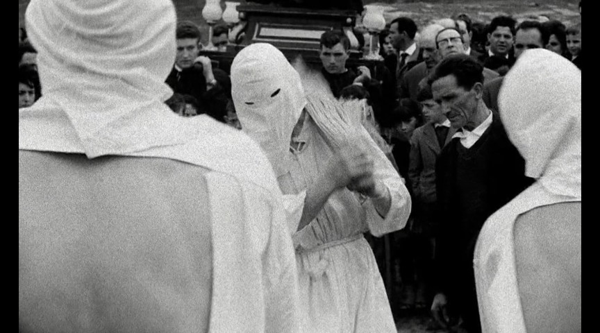 Desde el punto de vista sociaológico moral,Esteva no estaba a favor de la normalización de la crueldad expuesta en el largometraje. Es evidencia de la ceguera popular, más bien, y en gran medida una de las razones por las que se le mutiló más de 20 por ciento de la obra. Fijaos en la secuencia Rapa das Bestas. Se comeinza con una especie de poema que reza “Galicia. En camino de América el hombre se ha ido en busca de fortuna. Lleno de saudade. VOlverá viejo.Galicia. Pueblos enteros sin hombres.” La serie fotográfica de mujeres laborando y arando, mujeres jpovenes es imperdible pero en seguida da lugar lo que corresponde la fiesta gallega #De las bestias” en la que los aldeanos acorralan caballos en un curro y luchan cuerpo a cuerpo con ellos para inmovilizarlos y cortarles las crines. El espectáculo es deprimente aunque la fotografía, como dije es idónea. Entre los principales pasajes se pueden mencionar la corrida de toros y el plato fuerte la penosa carrera de los burros flojos en Casabermeja, Málaga. El santo cristo de Xende donde los enfermos ya rehabilitados deben participar en una procesión dentro del ataúd para agradecimiento. Por otro lado está la confusión de la coca de una región con el diablo pagano y la quema del Judas con cohetones en la plaza pública, los endemoniados de Nuestra Señora de Corpiño en Lalín que recuerdan las fiestas de la mojiganga en la cuenca del Papaloapan, Veracruz. Debo mwncionar una fe de erratas en el minuto 51:27 los suntítilos deben decir “there were times when the hysteria (not story) was contagious”. Además de estos rituales son dignos de mención la semana santan en Verges, Girona con ese contraste sublime de la noche y los enmascarados,la danza de los zancos de Anguiano Rioja que por cierto no son mencionados en el video pero me los conozco bien. En dicha danza de los zancos los danzantes llevan chaleco de colores y tocan castañuelas en las manos mientras descienden la cuesta. Después los flagelantes de San Vicente de SOnsierra,Haro, y la Semana Santa de Híjar, Teruel y por supuesto, la escena desagradable del despeñe del burro por los encapuchados ascendiendo la cuesta ,ientyras han cargado de cruces al animal y lo consideran un tipo de demonio. No se pierdan el baile flamenco del final en Barcelona.