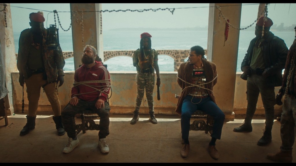 Pero fijaos que es la primera vez que los protagonistas comprueban que su “misión” no tiene nada que ver con justicia ni con rescate, sino con crear caos fotogénico; la desolación viene de entender que ya están demasiado atrapados en el juego para salirse, por eso cuando sale del bus y el americano corre a esconderse le dan su siguiete misipin hacia el gigantón Misile a quien debe retirarle el móvil, a pesar de estar rodeado de escoltas y alcanzar éxito por mostrarles la bomba, la cual de todas formas explota mientras huye en la motocicleta robada en la playa. Después, ya con su compañero, ambos #1 y 2, van hacia la tierra de Barka o Green House con los adolescentes guerrilleros que custodian a Cherif y así, se escala del experimento de Ngor del plano simbólico al bélico porque Barka encarna un territorio rural precarizado, pero todavía no colonizado por las grandes infraestructuras extractivas; y allí son llevados por Onaye a quien le dieron el móvil del enorme Misile. Cherif y su hijo personifican esa comunidad ambivalente, entre desconfianza y necesidad de “progreso”.Justamente aquí,en el rescate exitoso de Cherif, entregado a su hijo soilo opara volar en pedazos, dicha “liberación” de Cherif que aparentemente es un éxito moral de #1 y #2, queda atravesado por la sospecha de que todo está guionado por la voz, ya que la liberación solo la logran gracias a la enorme cantidad que #1 le transfiere a los antagonistas y así, aunque no trascienda discirsivamente en la trama, el auditorio sabe que la voz, necesita esa imagen de 2 héroes o malditos occidentales salvando locales o bien repartiendo justicvia en contra de las células del FLAO Frente de Liberación de África de Oeste, para legitimar futuras operaciones y desestabilización mundial. EL filme cierra el arco fatalista en su última misión, con el reaccionario Daniel, wx profesor de América y ahora rumiando en contra repleto de “feligreses” opuestos a la esclavitud del sueño americano y demás. Daniel está enfermo terminal y la voz sin el menor escrúpulo se despide pero, qué ocurre, que ambos intentan zafarse de la aplastante condena simbólica que ahora representan además de regresar con sus familiares. No lo lograrán, a pesar de apuñalar a Daniel frente a sus feluigreses tal como lo planeo la voz y aplaudió antws de que ambos violaran en mil pedazos con el desenlace.Lo verdaderamente oprobioso pero sobre todo digno de pánico no es su similitud con los tiempos contemporáneos, sino que los potenciales terroristas puedan ser víctimas ellas mismas de los actos vandálicos y destructivos que parezcan enarbolar y así, ignoremos cuantros experimentos humanos en la precaridad sirvan como carne de cañón para fuerzas oscuras que aparente, en este historia falsamente odien a América y sus intereses. El nuevo reinicio en París escandaliza aunque ni una palabra se haya dicho salvo el mismo rancio dicurso “en el principio fue Zero, luego uno, luego millones”.