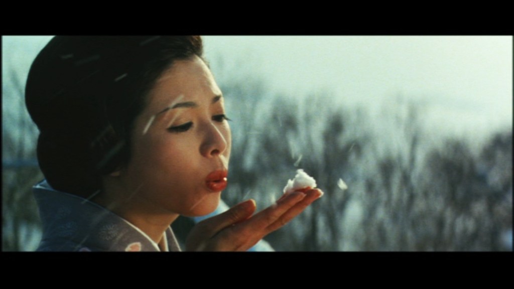 Son dignas de mención las escenas en que Kikunaka le recita el poema de Muro Saisei respecto al hielo cuando escuchan ambos el estruendoso y peculiar sonido del hielo rompiéndose fuera en una notoriedad natural que da vida a un pasaje imborrable. Sucede lo esperable, Ayako engaña y se burla al parecer de kikunaka así que el marido le pide a Yuki lo acompañe para ir a cobrar venganza contra los pillos pero el jovencito Seitaro, quien ya muerto de celos había intentado matar al marido una noche a dormir, logra convencer a la Madame y en un accidentado periplo por la nieve parten y se hospedan por la noche en que Seitaro promete darle masaje y protegerla pero sin poder ocultar sus intenciones eróticas hacia ella y de allí la escena de la daga en que forcejean ambos. Por supuesto, es una historia triste para una mujer con tanta capacidad de amar y que como su nombre, apenas se derritió como la nieve, Muy a pesar de que Kikunaka y también Seitaro coincidieron en llamarla mujer de nieve o hielo por su frialdad descomunal.