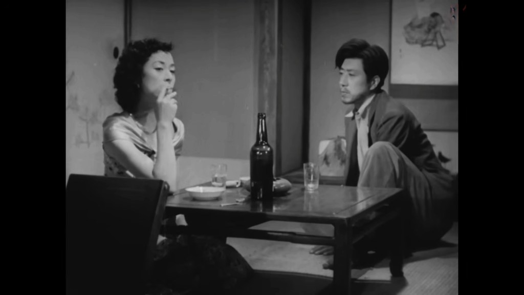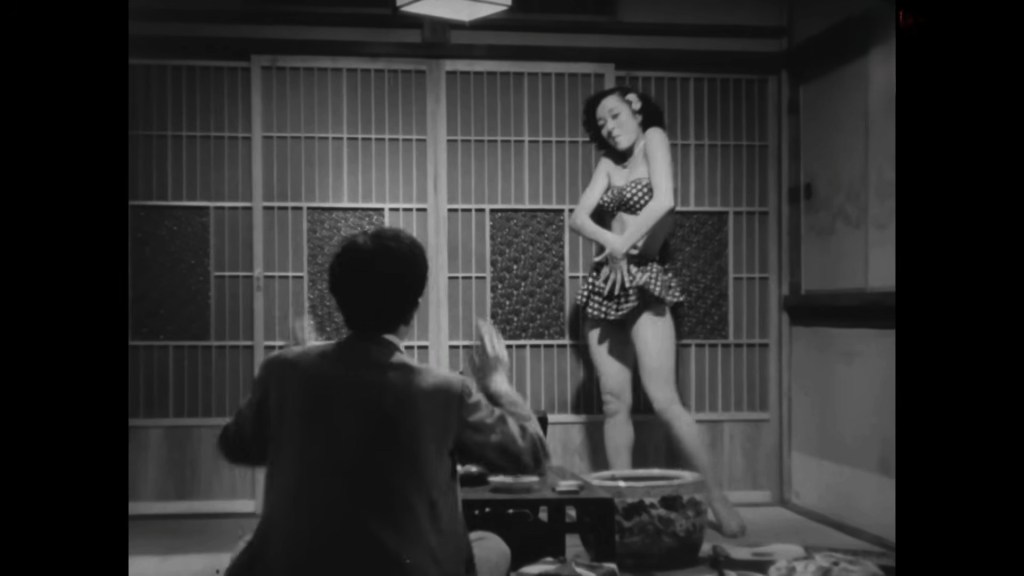 No recae en un solo personaje el peso dramático de este lienzo de inmediata posguerra japonesa. Pero comete un error quien vea en esta peculiaridad una debilidad del filme en vez de una panorámica social un poco más amplia. Hasta cierto punto paradójica, -y no misógina como más de un reseña que leído yerran en juzgar- tratándose en un Japón muy conservador de mediados del siglo anterior en el que no podías esperar que la sociedad en general viese con normalidad a las Koi-san, Taeko la hermana menor de las Makioka quien en realidad era una excepción. En este melodrama, por un lado tenemos a Taiko la geisha bailarina exótica que tuvo la suerte de ser estafada por el aprendiz de escritor y fracasado Ryosuke, le bailó y todo, pero el muy ebrio ni siquiera pudo pagarle. Taiko al ver los calcetines rotos y su rostro de querubín cay+o rendida y desde entonces, o más bien después de recibir una misiva en su trabajo donde el borracho le paga una parte del adeudo, emprende su busca y lo halla en su pisito en la planta alta, roto y lleno de ratas que le causaron un espanto a la sonriente Taiko. Desde ese momento, primero con el pretexto de celebrar el aniversario luctuoso de su mamá y luego con cualquier asunto, Taiko le lleva galletas, dulces u comida al desaliñado y malhumorado escritor que es mal agradecido y machista (si se le puede decir a sí a los varones de una cultura de guerra e inmediata posguerra que veían a la mujer como recatada y obediente antes que de carácter resuelto como Taiko. Encerrado en el apartamento repasa versos y escribe y leemos “Es mañana el día llamado mañana, caminando con paso ligero, con un paso suave día tras día” de Shinobiyoru.